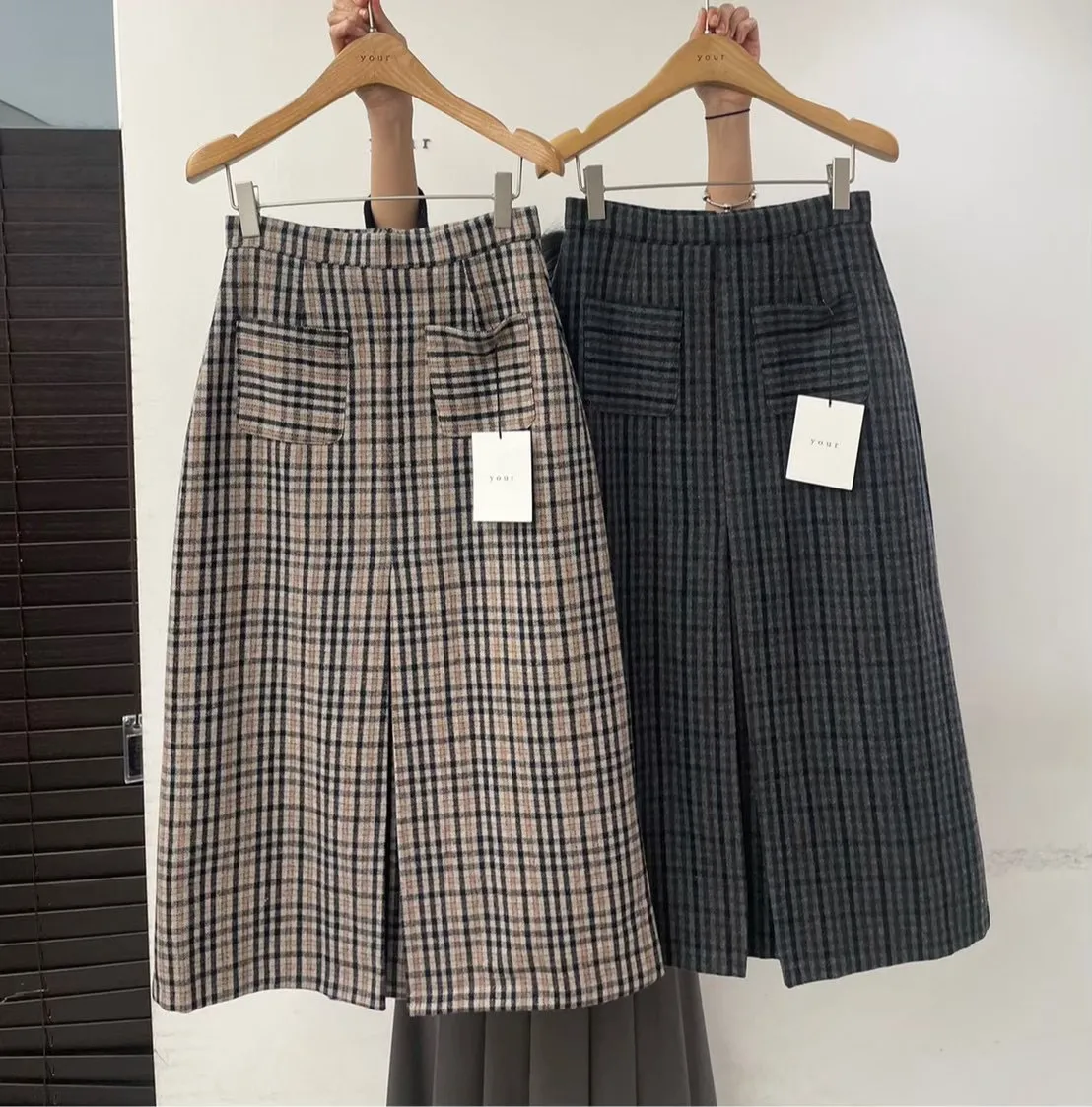 【11D01-AB韓國製雙口袋毛呢格紋裙】