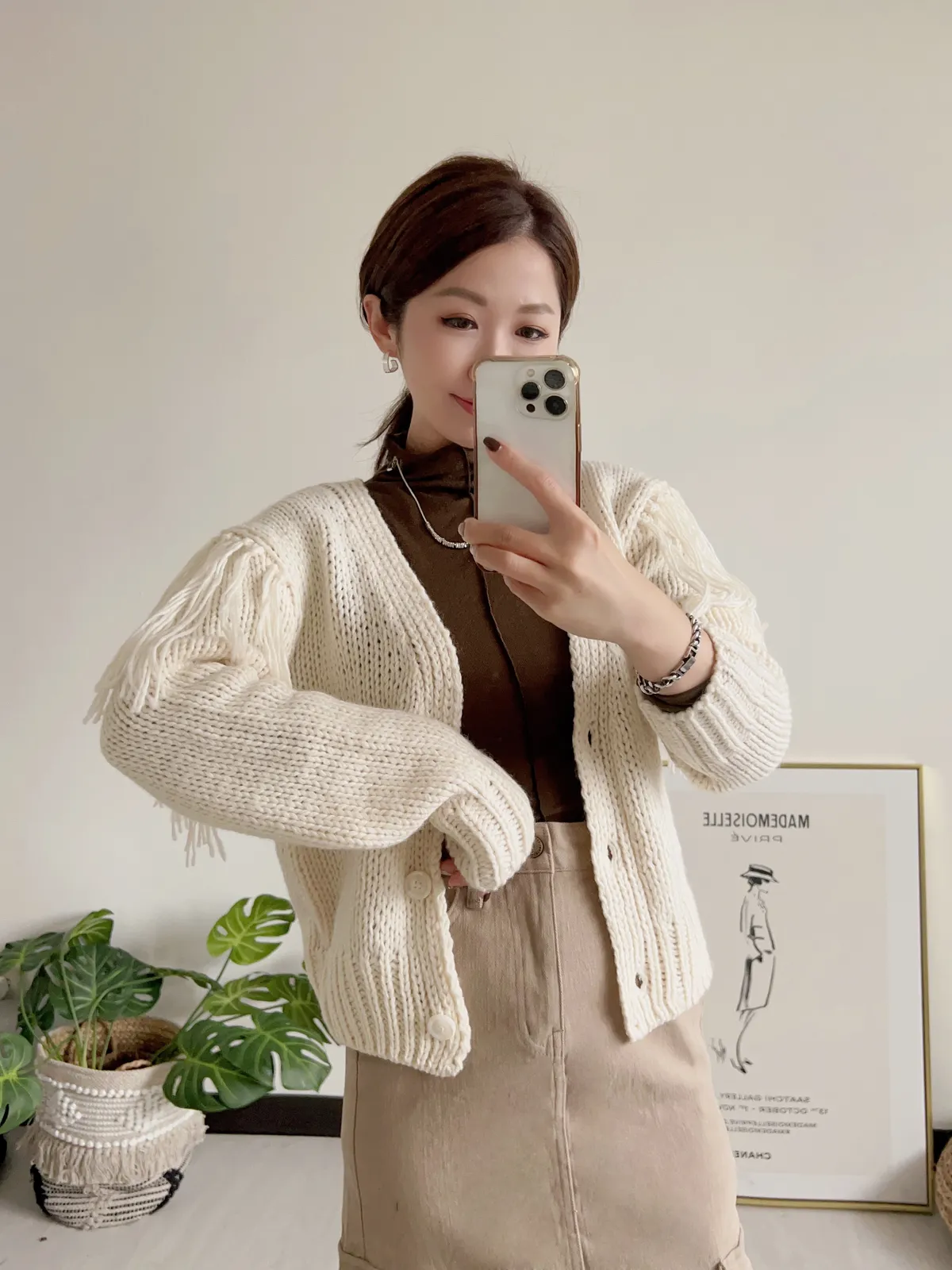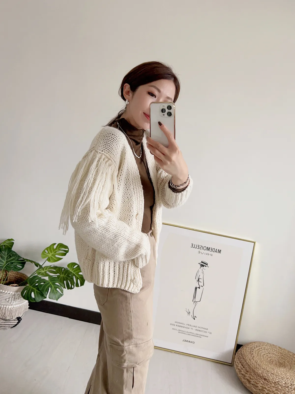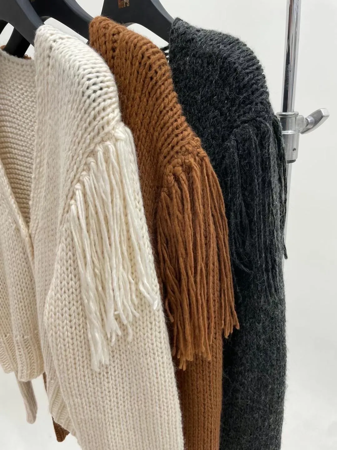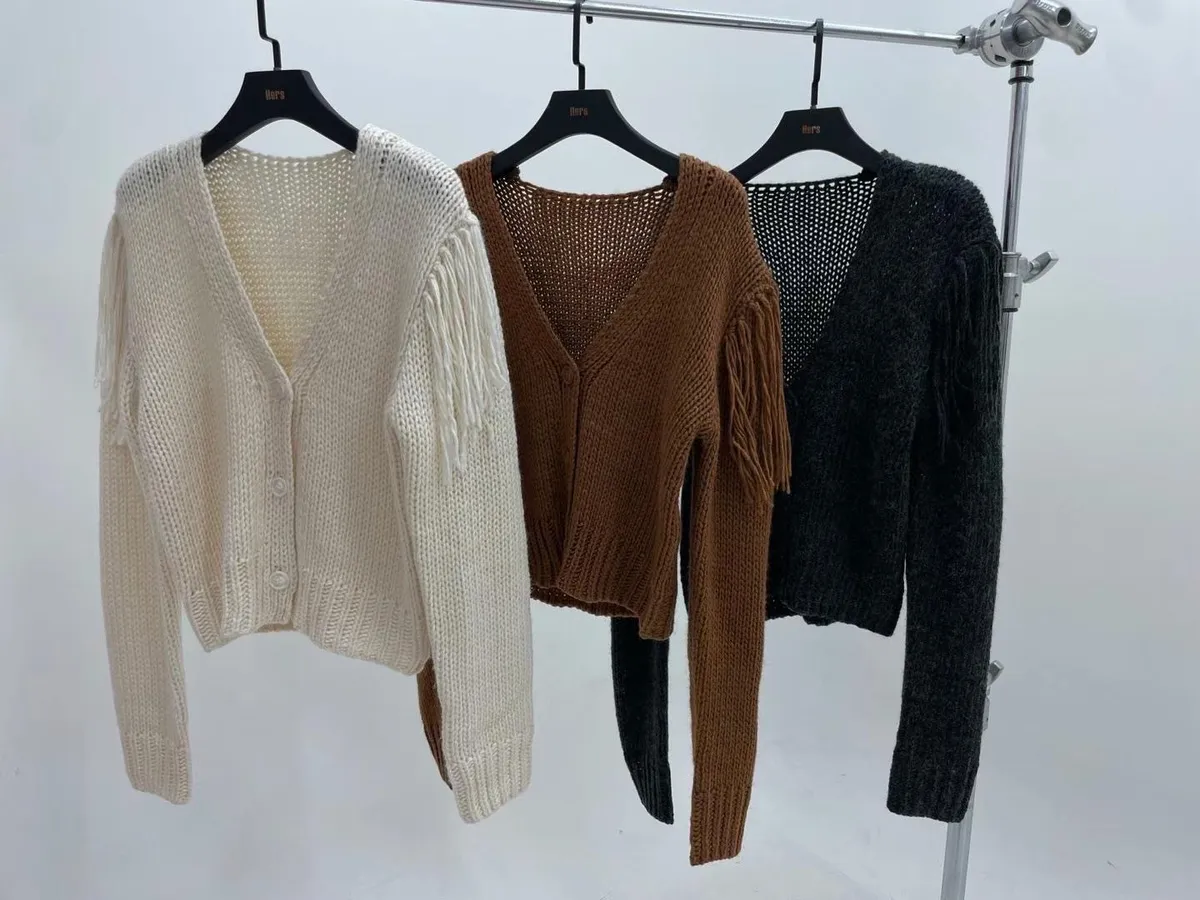 手臂上的長流蘇太漂酿😍 會隨著走路時自然擺動💃 粗毛線針織手感軟軟的 不會刺喔! 搭配同色的霧感排扣 質感超級好!! 下擺跟手臂的收編 特別設計成凹凸立體感💫 長度約蓋過屁股一半 簡單設計又百搭 好看✌✌